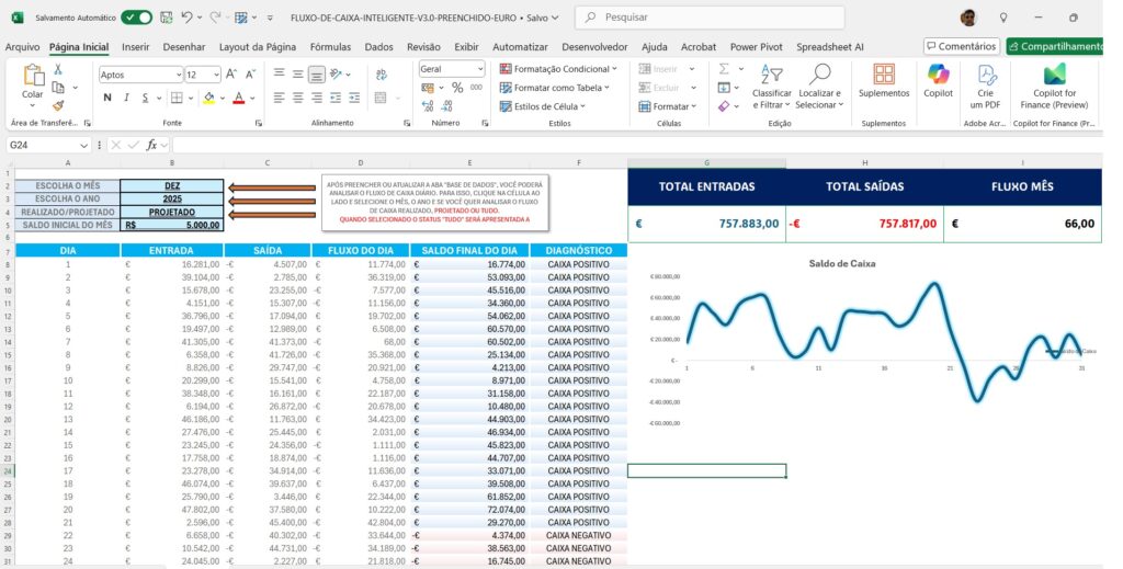 3) Emite Relatório AUTOMÁTICO E DINÂMICO do FLUXO DE CAIXA PROJETADO E REALIZADO mensal, dethado a nível de lançamento;